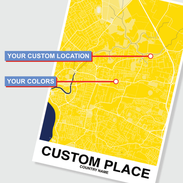 If you don't find your location of interest in our online collection, no problem! We'll custom map it for you. When you order a custom map, you also get to select custom colors so you can match your new art prints to any decor.
